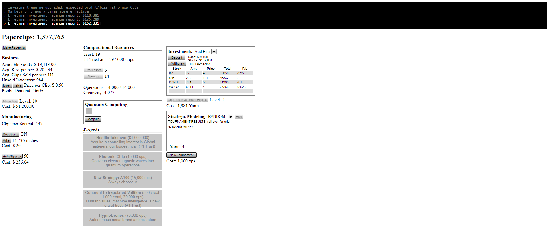Universal Paperclips is a new game that pits you against market forces. As an AI, your job is to make paperclips - but as you earn more money, you get better and new ways to do this job. Make automated AutoClippers, increase your Marketing level, and become the kingpin (AI-pin?) of the Paperclip industry.