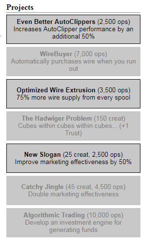 | Optimized AutoClippers | 5,000 ops | Even Better AutoClippers | Increases AutoClipper performance by an additional 75% | |